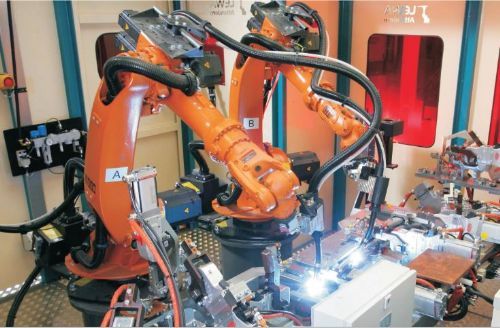 焊接機(jī)器人是從事焊接(包括切割與噴涂)的工業(yè)機(jī)器人,它主要包括機(jī)器人和設(shè)備兩部分。其中,由機(jī)器人本體和控制柜(硬件及軟件)組成;而焊接裝備,以弧焊及點(diǎn)焊為例,則由焊接電源(包括其控制系統(tǒng))、送絲機(jī)(弧焊)、焊槍(鉗)等部分組成。對(duì)于智能機(jī)器人,還應(yīng)配有傳感系統(tǒng),如激光或攝像傳感器及其控制裝置等。